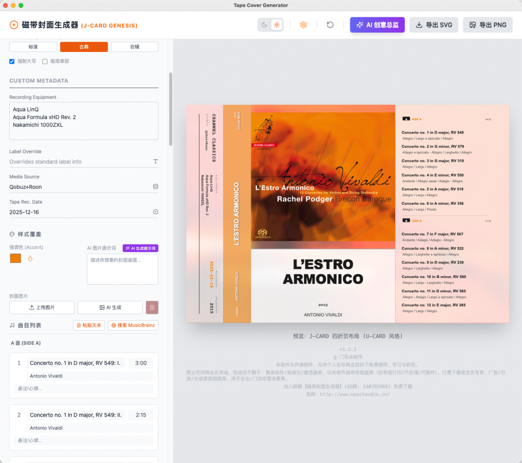 Work实体,自动将曲目按 “作品-乐章” (如 Symphony No. 5 -> I. Allegro) 进行归类排版,告别冗长的重复标题。 - • 专业演职员表 (Enhanced Credits): 自动抓取并显示 制作人 (Producer)、录音/混音师 (Engineer) 等幕后功臣。这些信息会自动填充到 J-Card 背面的 “Tech Specs” 区域,让您的磁带封面更具专业收藏质感。